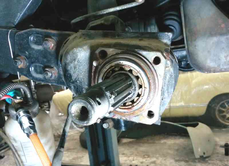 | 低回転で不調だったエンジンの原因が判明です。MSD用にガッツリ広げられたプラグギャップ!1.5mm以上あったでしょうか?規定値に戻してやったらアッサリ解消!キャブをチョコッと調整してみましたが、生まれ変わったかも?踏み込んでダイレクトに拭け上がり、気持ち良く落ち着いてくれるアイドリングに一安心!心配の種が一つ消えて、俄然やる気が出ます。早速リフトに移動してアップ!リアタイヤを外して目に入ったのは、クランプの無い差し込んだだけのEXパイプ・・・・!チェックの最中に排気漏れしてるな?と感じたのはお前かっ!お次はフロントの足回りのチェック!右ロアーのボールジョイントを筆頭に、4つ全てガタあり・・・・。特に右側は酷い!アウターのタイロッドエンドもガッタガタで、ハブベアリングも気持ち良いくらい音を立てて回ってくれます。見事に?右側全滅!ステアリングダンパーをおNEWに交換する前に、こっちを交換してやって欲しいものですな。クーラー付なので、スウェーバーが無いのが唯一手間が省けたかも???? |