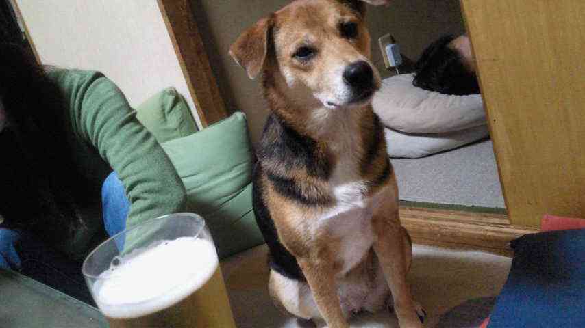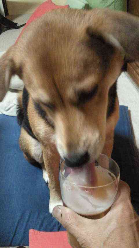 私の顔を見つめてBEERを催促するペス!暫く無視して放置プレーを楽しんだのですが、最後にはヨダレがダラ〜〜〜ッと・・・。そんなに欲しいのか?ヨダレが出るほど欲しいなんてアル中かっ!根負けしてグラスを差し出した瞬間、勢いよく半分くらい飲み干しました!! |
